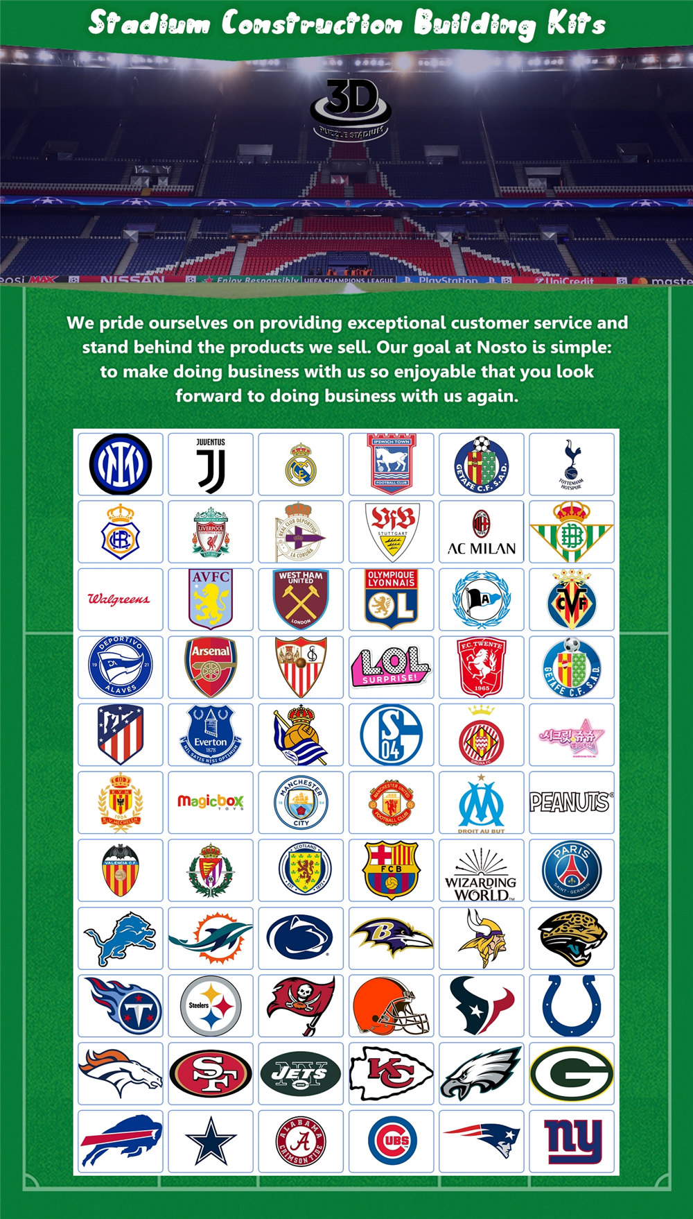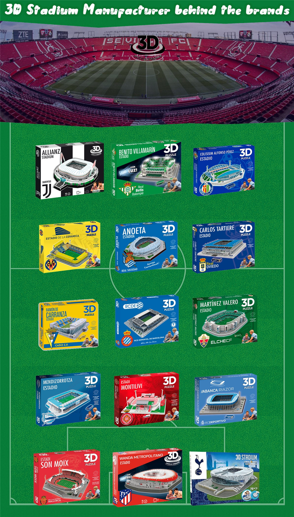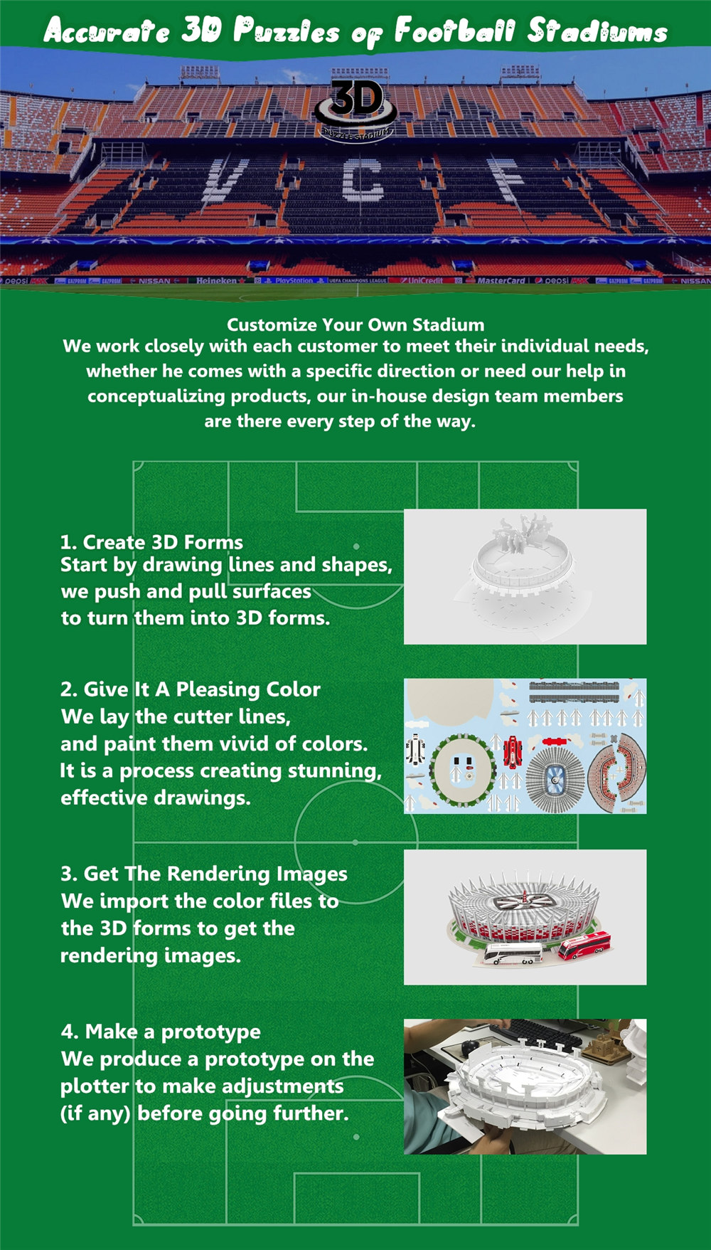 We have an in-house team of five designers skillful at 3D puzzle stadium project. The designers have a mix of interests and many years' experience, designing licensed products and working with artists and rights-holders. Thanks to them, who handle every aspect of the product design process, from the initial creative concepts to print-ready or production files.